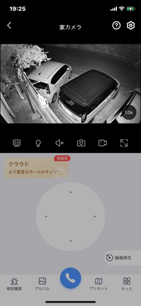 こちらは駐車場側をメインにして設置しましたが携帯からカメラの方角の調整や、警報音を鳴らせたり
