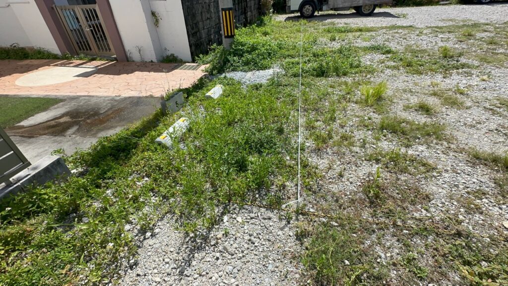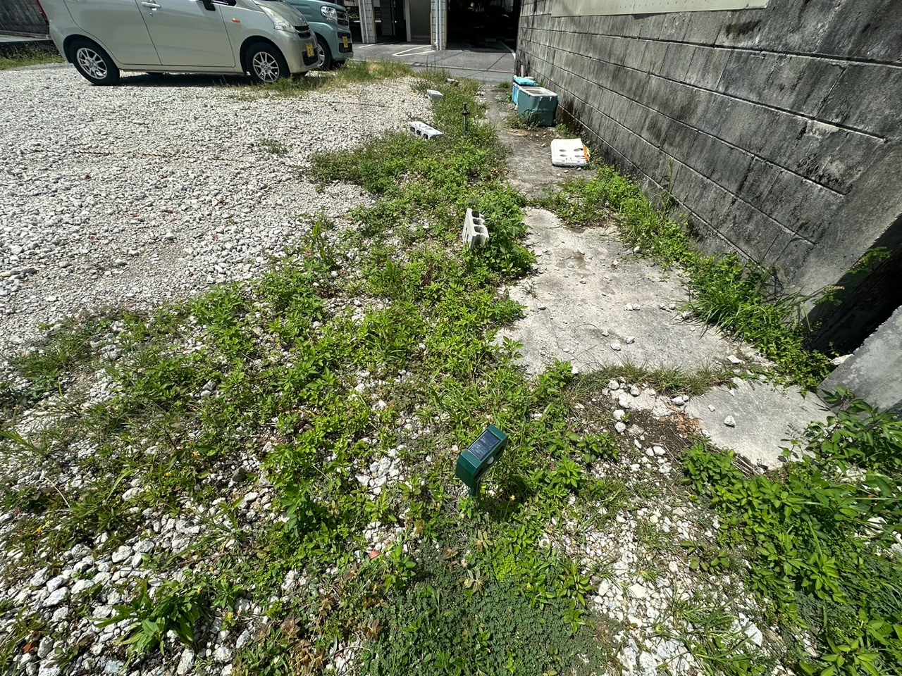 もちろんコンクリートで固めるという方法もありますが、予算的にオーバーすると言うことで、今回は『草なしくん』と防草シートの組み合わせでご提案させていただき、1箇所は『草なしくん』もう1箇所は『防草シート』となりました。