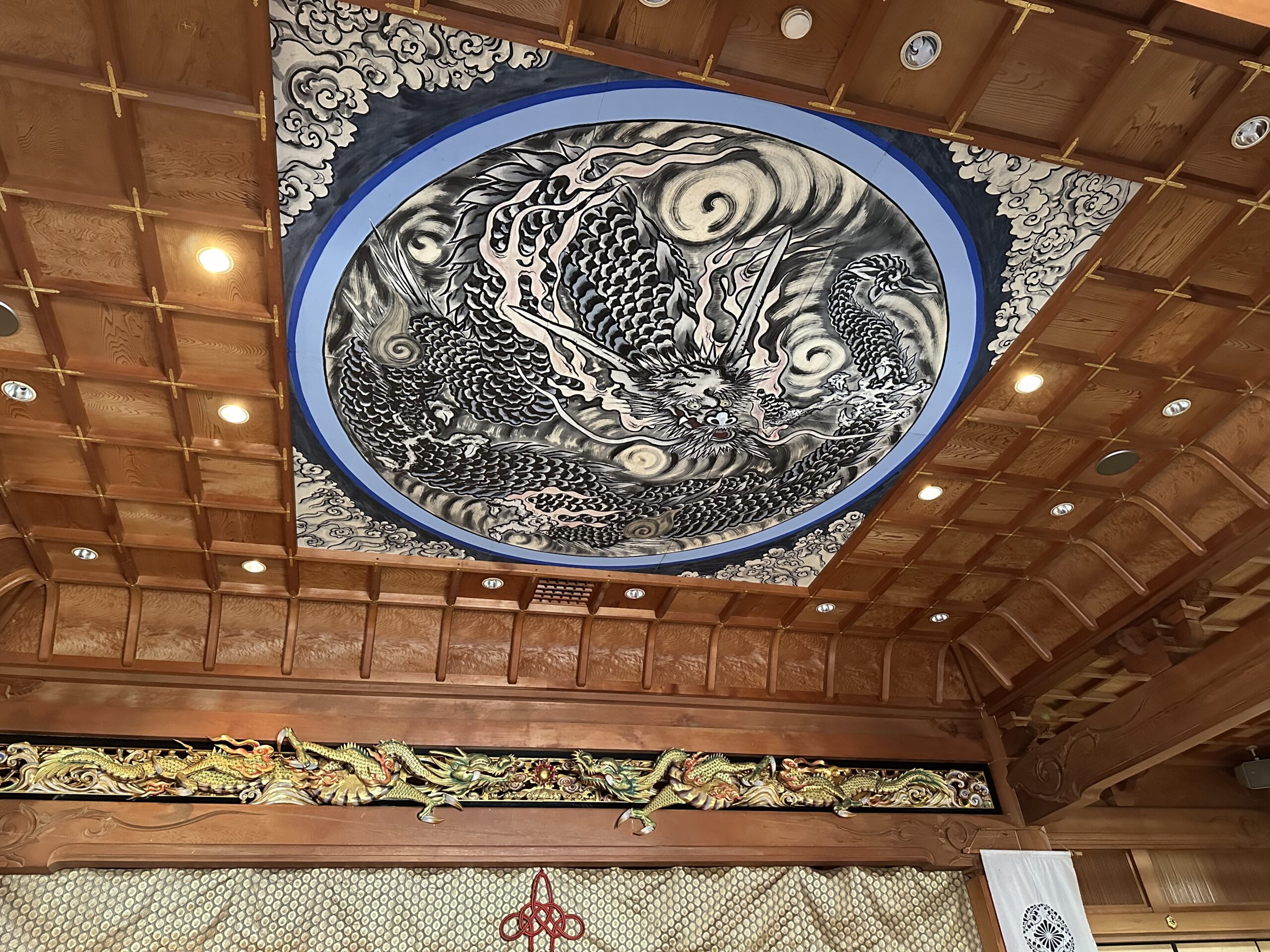 参拝するために中に入ると天井に立派な龍の絵が描かれてます、