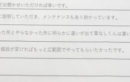 雑草の心配もなく、とても楽になりました。メンテナンスもあり安心です。