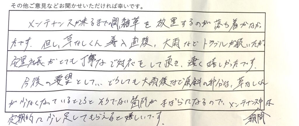 メンテナンスが来るまでの間、雑草を放置するのが落ち着かなかったです。但し、草なしくん導入後、大雨などトラブルが続いたが、安里社長がとても丁寧な対応をしていただき、すごくうれしかったです。