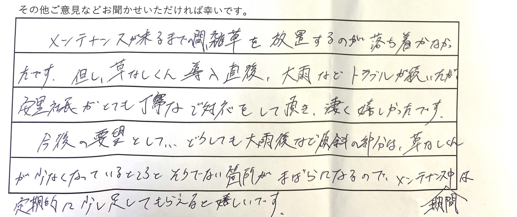 今後の要望として、どうしても大雨後など傾斜の部分は草なしくんが少なくなっている所とそうでない箇所がまばらになるので、メンテナンス期間中は定期的に少し足してもらえると嬉しいです。