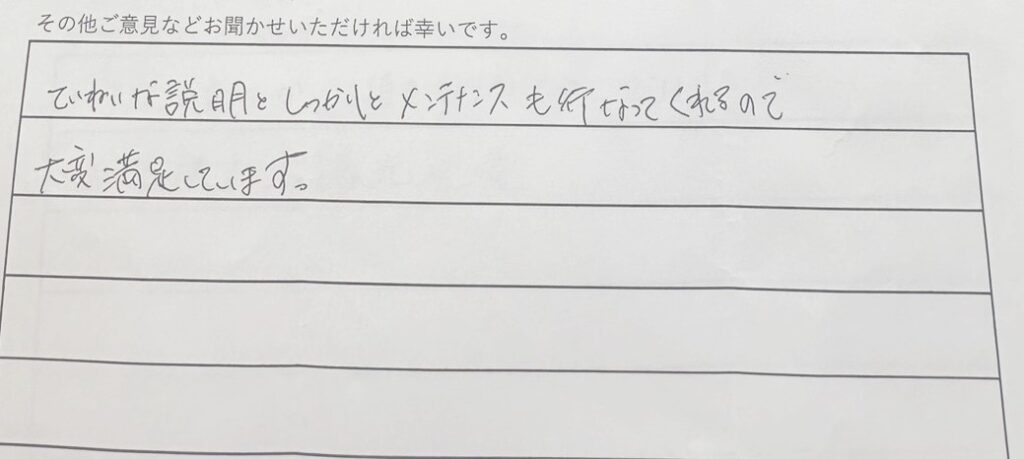 丁寧な説明としっかりとメンテナンスも行ってくれるので大変満足しています。